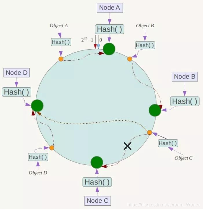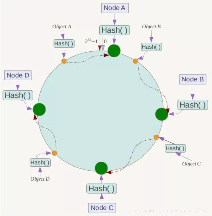 例如我们有Object A、Object B、Object C、Object D四个数据对象,经过哈希计算后,在环空间上的位置如下: