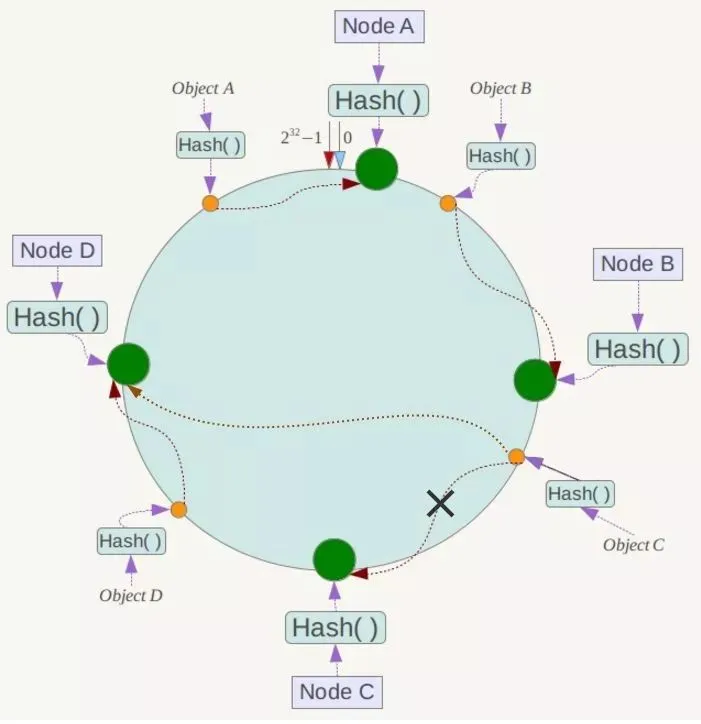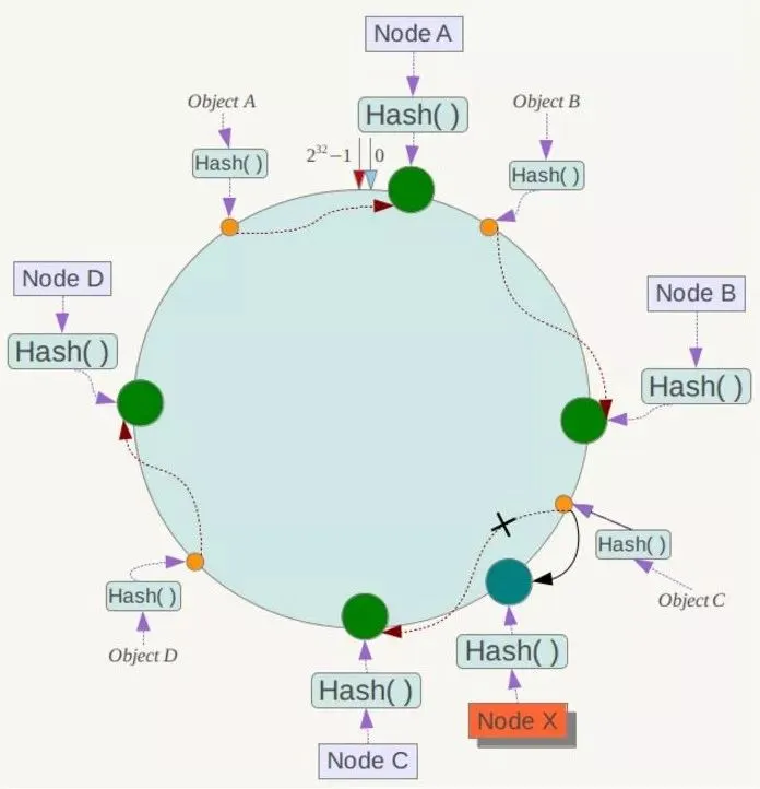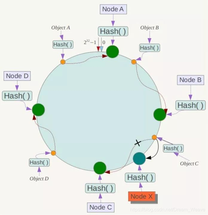 此时对象Object A、B、D不受影响,只有对象C需要重定位到新的Node X !一般的,在一致性Hash算法中,如果增加一台服务器,则受影响的数据仅仅是新服务器到其环空间中前一台服务器(即沿着逆时针方向行走遇到的第一台服务器)之间数据,其它数据也不会受到影响。
