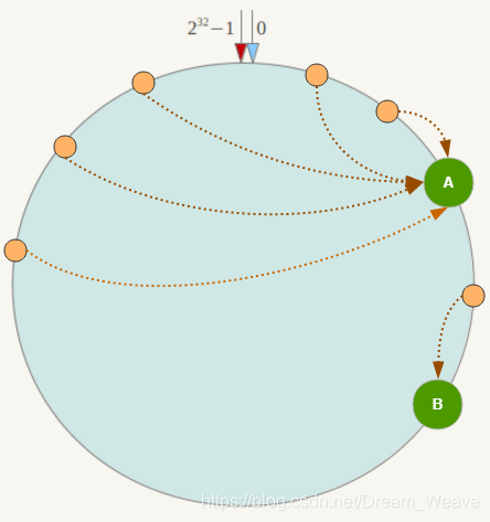 整个空间按顺时针方向组织,圆环的正上方的点代表0,0点右侧的第一个点代表1,以此类推,2、3、4、5、6……直到2^32-1,也就是说0点左侧的第一个点代表2^32-1, 0和2^32-1在零点中方向重合,我们把这个由2^32个点组成的圆环称为Hash环。