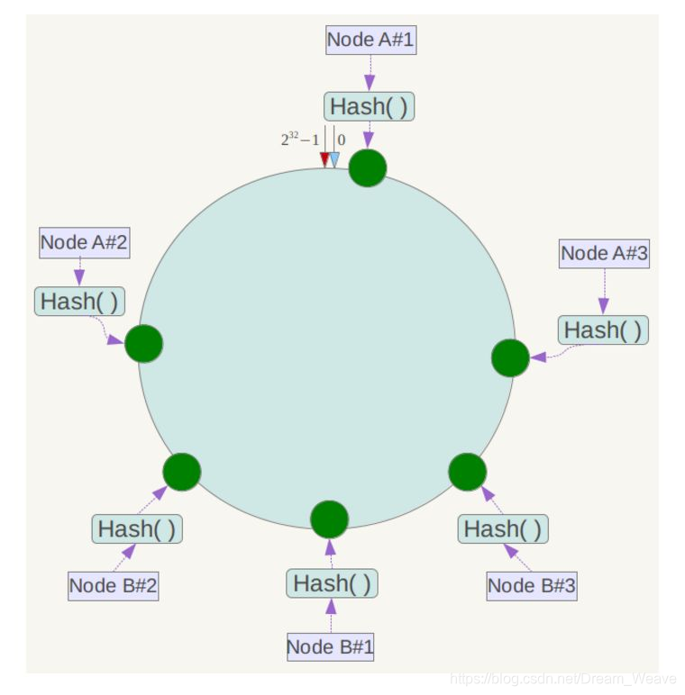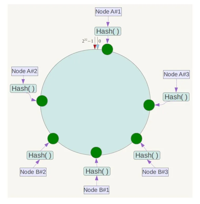 例如上面的情况,可以为每台服务器计算三个虚拟节点,于是可以分别计算 “Node A#1”、“Node A#2”、“Node A#3”、“Node B#1”、“Node B#2”、“Node B#3”的哈希值,于是形成六个虚拟节点: