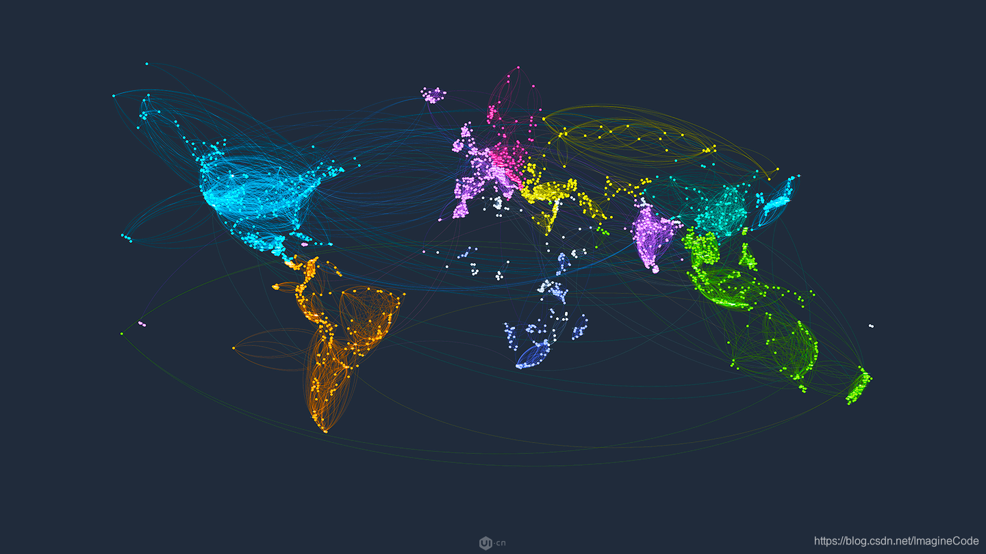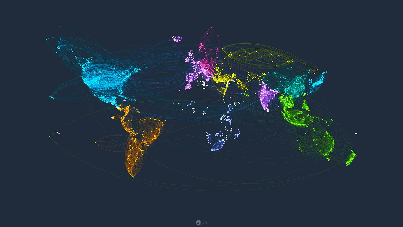 国家之间相互连通的旅游路线,颜色越相近的国家,表明两国家的人们互动越频繁