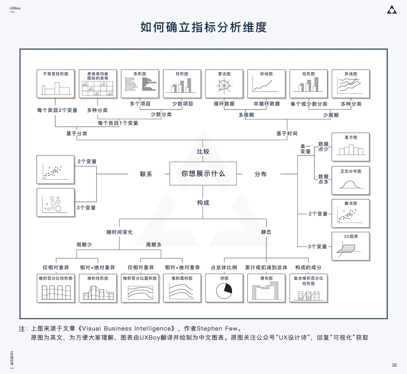 当确定好分析维度后,事实上我们所能选用的图表类型也就基本确定了。接下来我们只需要从少数几个图表里筛选出最能体现我们设计意图的那个就好了。