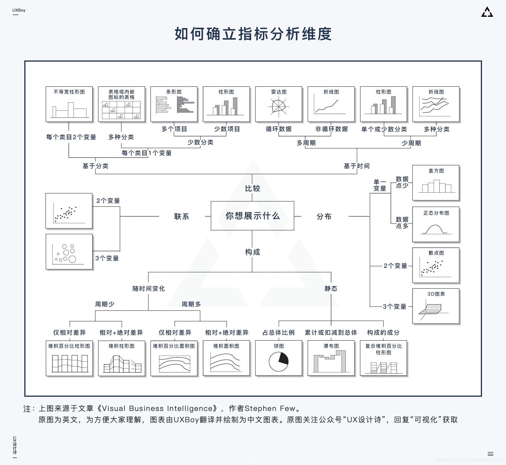 上图向大家展示了数据分析常用的4个维度,我们在选定指标后,就需要跟项目组其他小伙伴讨论:我们的各个指标主要想给大家展示什么,更进一步的讲,是我们想通过可视化表达什么样的规律和信息。而上图,可以引导我们从“联系、分布、比较、构成”四个维度更有逻辑的思考这个问题。