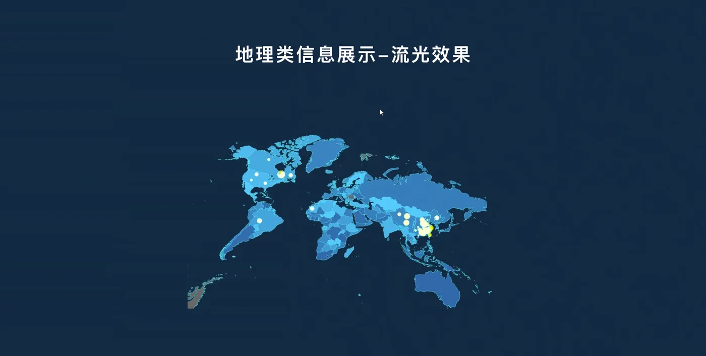 根据定义好的设计风格与选定的图表类型进行合理的可视化设计。目前来讲大屏可视化主要有指标类信息点和地理类信息点两大可视化数据。指标类信息点可视化效果相对简单易实现,而地理类信息点一般可视化效果酷炫,但是开发相对困难,需要设计师跟开发多沟通的。地理类信息一般具有很强的空间感、丰富的粒子、流光等动效、高精度的模型和材质以及可交互实时演算等特点,所以对于被投电脑、大屏拼接器等硬件设备的性能会有要求,硬件配置不够的情况下可能出现卡顿甚至崩溃的情况,所以这点也是需要提前沟通评估的。
