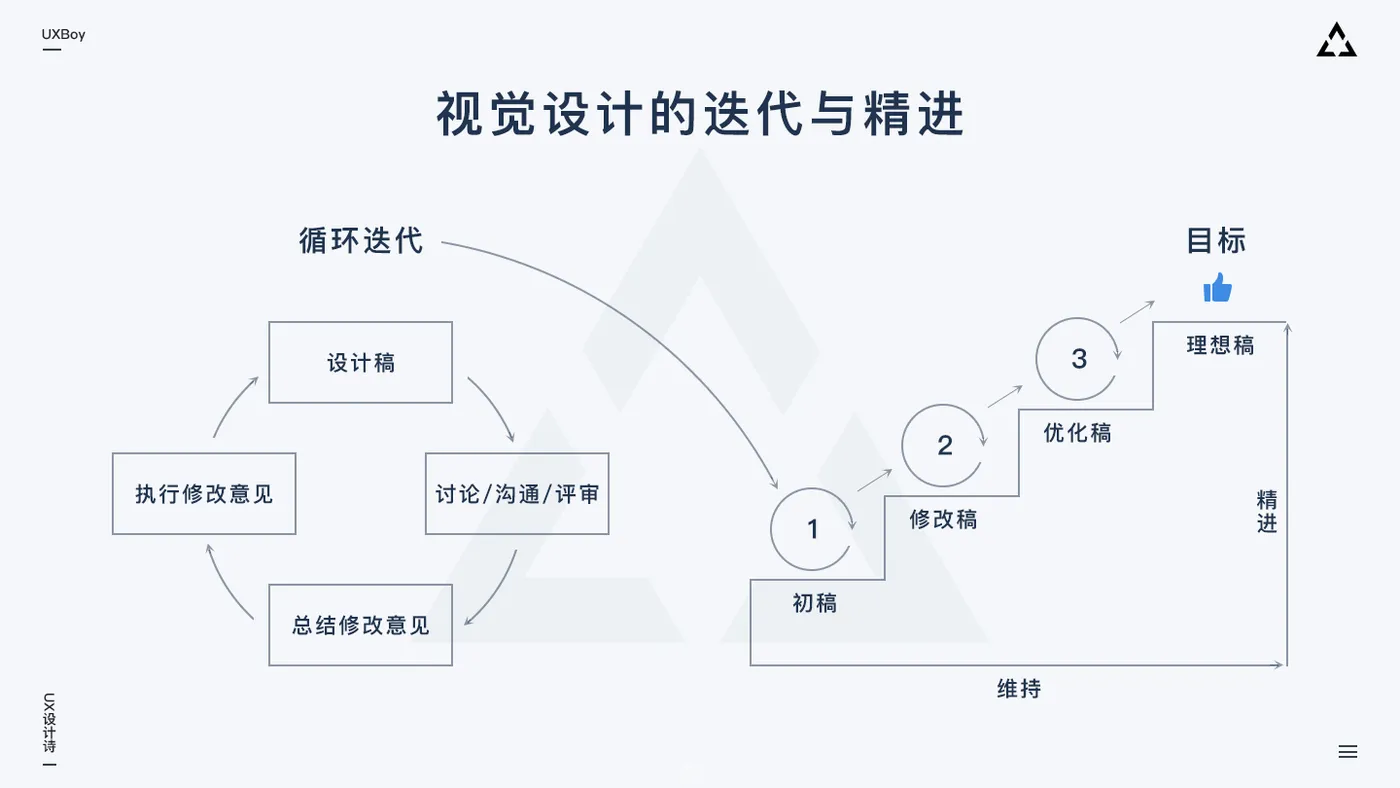 样图沟通环节,最初的样图不需要十分精致,我们可以把它理解为一个“低保真”原型,然后通过不断沟通修改,让它逐步完善精致起来,也就是小步快跑,避免那种一下子走到终点,然后又大修大改的情况。