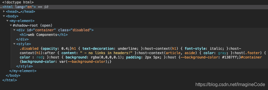 //生命周期函数的顺序:constructor -> attributeChangedCallback -> connectedCallback //attributeChangedCallback要在connectedCallback之前执行的原因: //1.web组件上的属性主要用来初始化配置。这意味着当组件被插入DOM时,这些配置需要可以被访问了 customElements.define('my-element',class extends HTMLElement{ static get observedAttributes() { return ['disabled']; } //构造函数一般是用来初始化状态和设置Shadow DOM。 //当时一个元素被创建时将会调用构造函数,如document.createElement constructor() { super(); //使用Shadow DOM,自定义元素的HTML和CSS完全封装在组件内。这意味着元素将以单个的HTML标签出现在文档的DOM树种。其内部的结构将会放在#shadow-root。 let style = document.createElement('style'); const shadowRoot = this.attachShadow({mode: 'open'});// 定义一个Shadow root,mode:'open'意味着可以再开发者工具找到它并与之交互;mode:closed则相反 //Shadow DOM还提供了局部作用域的CSS //所有的CSS都只应用于组件本身 //元素将只继承最小数量从组件外部定义的CSS,甚至可以不从外部继承任何CSS //在实际插入DOM前,它是不可见也不可解析的。这意味着定义在内部的任何资源都无法获取,任何内部定义的CSS和JavaScript只有当它被插入DOM中时,才会被执行。 //组件的所有样式都被定义在style标签内,如果你想使用一个常规的<link rel="stylesheet">标签,你也可以获取外部样式 shadowRoot.innerHTML = ` <div id="container" class="disabled"> <h1>web Components</h1> </div> `; shadowRoot.appendChild(style); //当Shadow root被创建之后,你可以使用document对象的所有DOM方法, this.container = this.shadowRoot.querySelector('#container');//查找元素 //还可以使用:host选择器对组件本身进行样式设置 //从外部定义在组件本身的样式优先于使用:host在Shadow DOM中定义的样式 style.textContent = '.disabled {opacity: 0.4;}' + 'h1 { text-decoration: underline; }' + ':host-context(h1) { font-style: italic; }' + ':host-context(h1):after { content: " - no links in headers!" }' + ':host-context(article, aside) { color: gray; }' + ':host(.footer) { color : red; }' + ':host { background: rgba(0,0,0,0.1); padding: 2px 5px; }'+ ':host {--background-color: #1387ff;}'+ '#container {background-color: var(--background-color);}'; } //当这个元素被插入DOM树的时候将会触发这个方法 //在connectedCallback之后进行元素的设置 //这是唯一可以确定所有的属性和子元素都已经可用的办法,如document.body.appendChild connectedCallback() { } //当元素从DOM中移除的时候将会调用它 //在用户关闭浏览器或者浏览器tab的时候,不会调用这个方法 disconnectCallback() { } //当元素通过调用document.adoptNode(element)被采用到文档时将会被调用 adoptedCallback() { } //每当将属性添加到observedAttributes的数组中时,就会调用这个函数 //这个方法调用时两个参数分别为旧值和新值 //这个方法只有当被保存在observedAttributes数组的属性改变时,才会调用,其他属性改变则不会 //web组件上的属性主要用来初始化配置,状态 //当组件被插入DOM时,这些配置需要可以被访问了 attributeChangedCallback(attr,oldVal,newVal) { if(attr === 'disabled') { if(this.disabled) { this.container.classList.add('disabled'); } else { this.container.classList.remove('disabled') } } } }) //调用customElements.get(‘my-element’)来获取这个元素构造函数的引用 const el = customElements.get('my-element'); //使用new element()来代替document.createElement()去实例一个元素 const myElement = new el(); //使用customElement.whenDefined升级元素时,可以调用回调,并会返回一个promise customElements.whenDefined('my-element') .then(() => { // my-element is now defined })