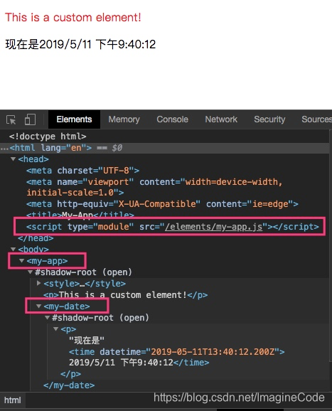 //my-date.js class MyDateElement extends HTMLElement { constructor() { super(); this.now = new Date(); const shadowRoot = this.attachShadow({mode:'open'}); shadowRoot.innerHTML = this.template(); } connectedCallback() { console.log('my-date element is connected'); } template() { return ` <p>现在是<time datetime="${this.now.toISOString()}">${this.now.toLocaleString()}</p> `; } } customElements.define('my-date', MyDateElement);
