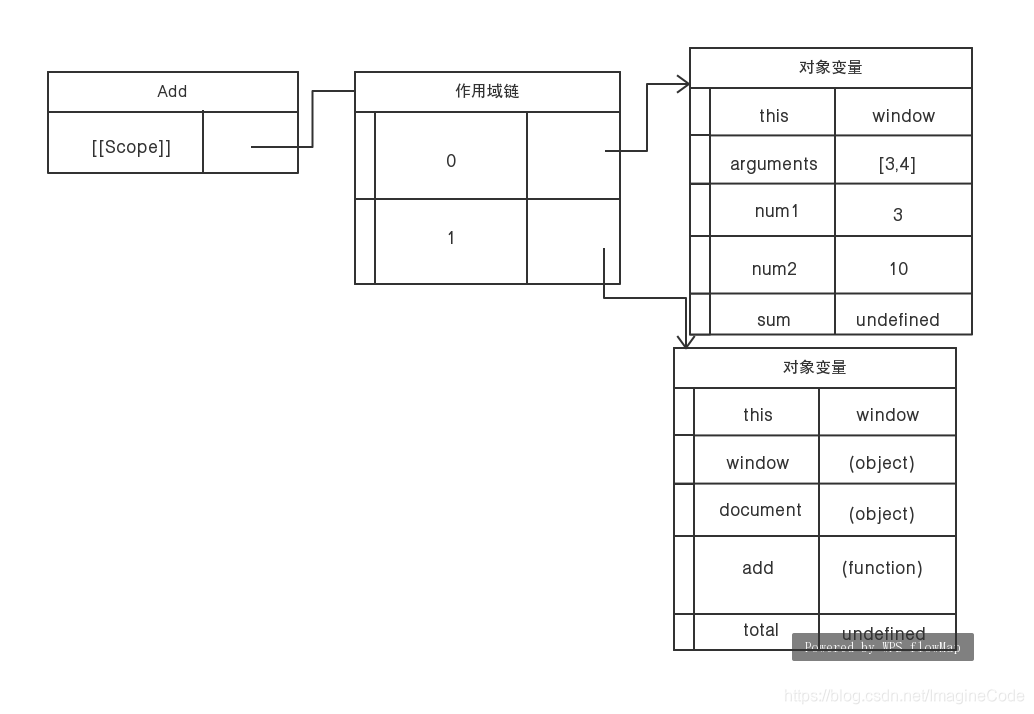 假设,我们调用add函数let total = add(3,4),现在看看add函数在执行时的作用域链: