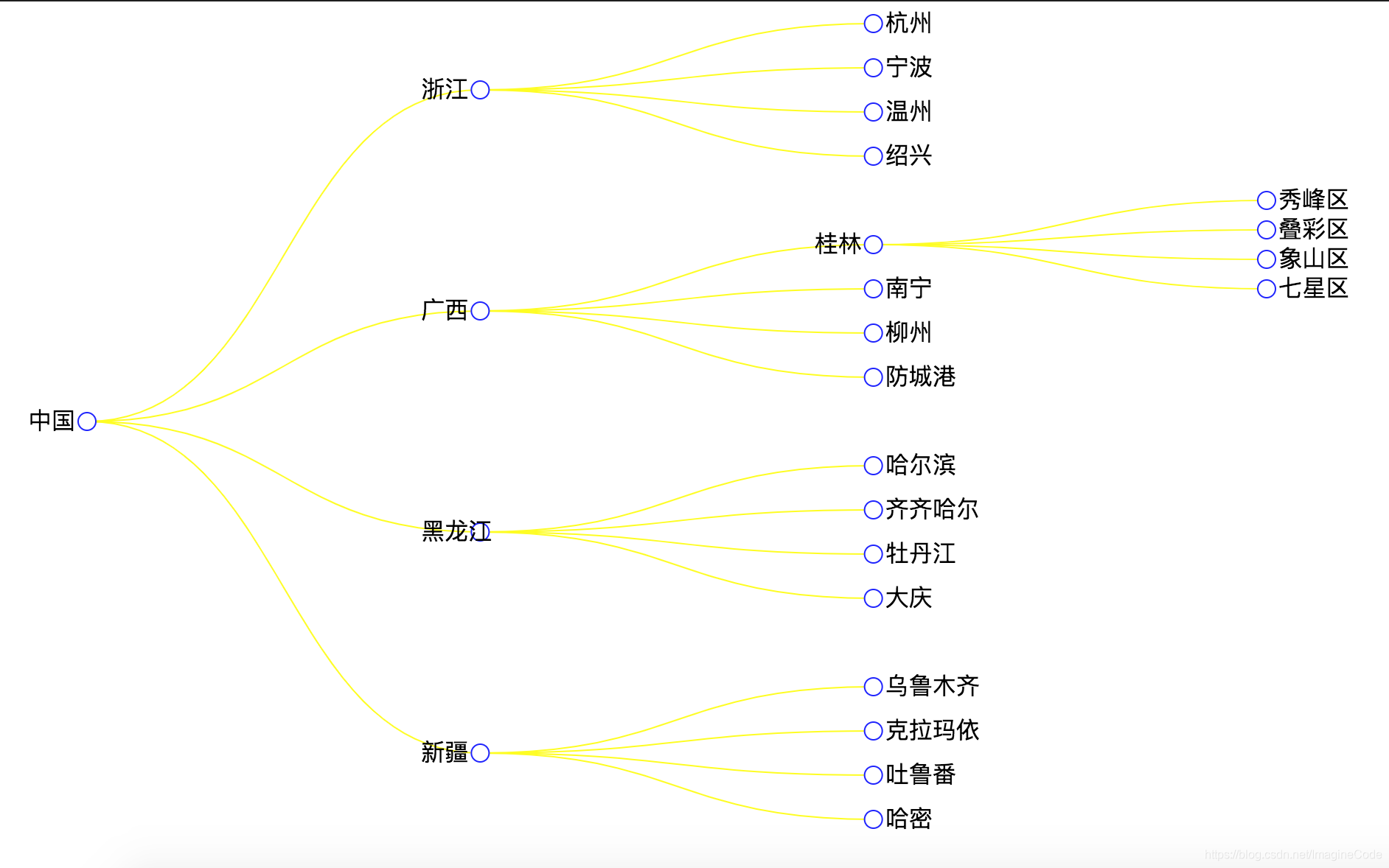 <body> <svg width="1000" height="1000"></svg> <script> var marge = {top:60,bottom:60,left:60,right:60} var svg = d3.select("svg") var width = svg.attr("width") var height = svg.attr("height") var g = svg.append("g").attr("transform","translate("+marge.top+","+marge.left+")"); var scale = svg.append("g") //1. 准备数据 var dataset = { name:"中国", children:[ { name:"浙江", children:[ {name:"杭州" ,value:100}, {name:"宁波",value:100}, {name:"温州",value:100}, {name:"绍兴",value:100} ] }, { name:"广西", children:[ { name:"桂林", children:[ {name:"秀峰区",value:100}, {name:"叠彩区",value:100}, {name:"象山区",value:100}, {name:"七星区",value:100} ] }, {name:"南宁",value:100}, {name:"柳州",value:100}, {name:"防城港",value:100} ] }, { name:"黑龙江", children:[ {name:"哈尔滨",value:100}, {name:"齐齐哈尔",value:100}, {name:"牡丹江",value:100}, {name:"大庆",value:100} ] }, { name:"新疆" , children: [ {name:"乌鲁木齐"}, {name:"克拉玛依"}, {name:"吐鲁番"}, {name:"哈密"} ] } ] }; //2. 创建层级布局 var hierarchyData = d3.hierarchy(dataset) .sum(function(d){ return d.value; }); //3. 创建一个树状图 var tree = d3.tree() .size([width-400,height-200]) .separation(function(a,b){ return (a.parent==b.parent?1:2)/a.depth; }) //4. 初始化树状图,也就是传入数据,并得到绘制树基本数据 var treeData = tree(hierarchyData); var nodes = treeData.descendants(); var links = treeData.links(); //5. 创建一个贝塞尔生成曲线生成器 var Bézier_curve_generator = d3.linkHorizontal() .x(function(d) { return d.y; }) .y(function(d) { return d.x; }); //6. 绘制边 g.append("g") .selectAll("path") .data(links) .enter() .append("path") .attr("d",function(d){ var start = {x:d.source.x,y:d.source.y}; var end = {x:d.target.x,y:d.target.y}; return Bézier_curve_generator({source:start,target:end}); }) .attr("fill","none") .attr("stroke","yellow") .attr("stroke-width",1); //7. 常规:建立用来放在每个节点和对应文字的分组<g> var gs = g.append("g") .selectAll("g") .data(nodes) .enter() .append("g") .attr("transform",function(d){ var cx = d.x; var cy= d.y; return "translate("+cy+","+cx+")"; }); //8. 绘制节点和文字 gs.append("circle") .attr("r",6) .attr("fill","white") .attr("stroke","blue") .attr("stroke-width",1); //文字 gs.append("text") .attr("x",function(d){ return d.children?-40:8;//如果某节点有子节点,则对应的文字前移 }) .attr("y",-5) .attr("dy",10) .text(function(d){ return d.data.name; }) </script> </body>