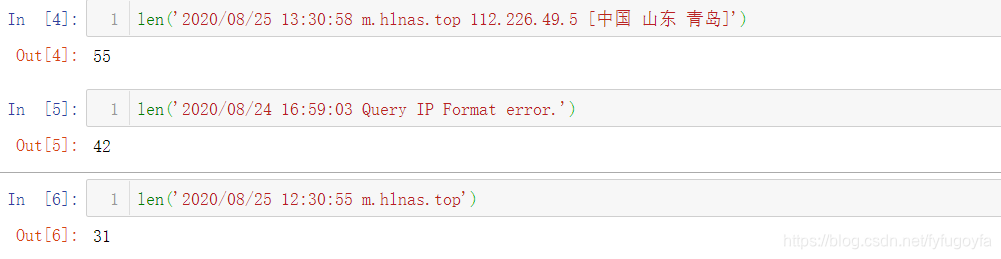 # 通网的日志 content列的字符串len('2020/08/25 13:30:58 m.hlnas.top 112.226.49.5 [中国 山东 青岛]') # 断网的日志 content列里的字符串len('2020/08/24 16:59:03 Query IP Format error.') len('2020/08/25 12:30:55 m.hlnas.top')