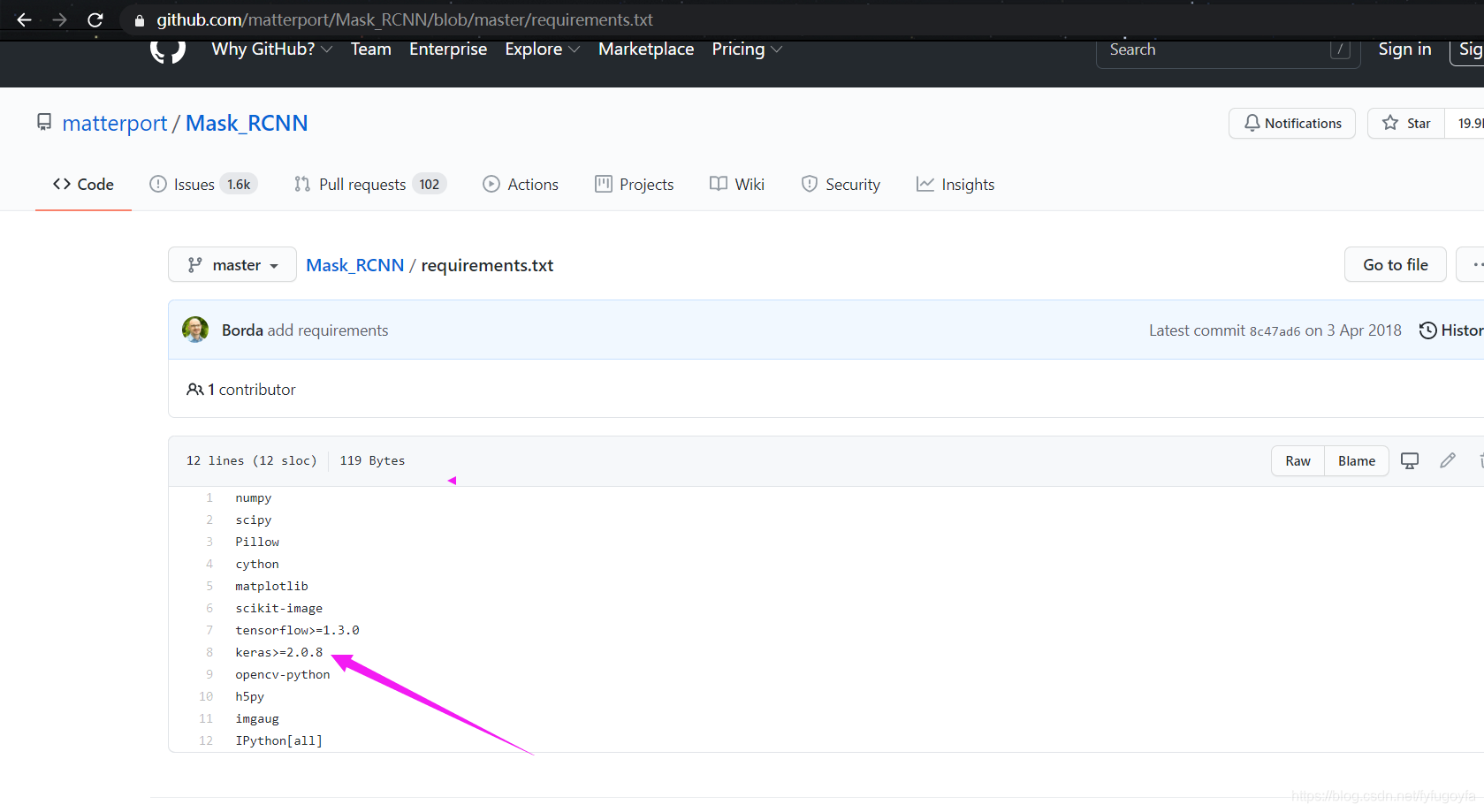 网上资料说造成这个错误的原因是 keras 版本不对,在 mask-rcnn 仓库文件中的 requirement.txt 中提到要求安装的keras>=2.0.8,如下所示: