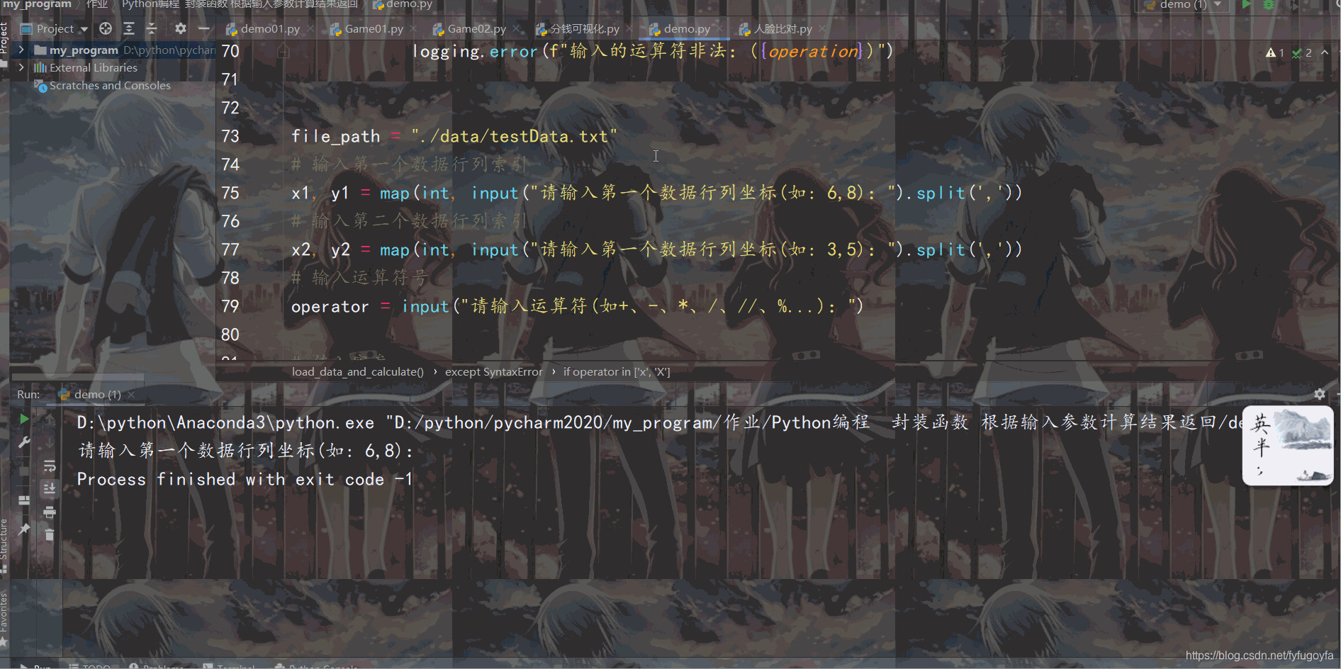 defload_data_and_calculate(point1, point2, operation, file="./data/random_data.txt"): """ :param file: 文件路径 为缺省参数:在调用函数时可以传 也可以省去的参数,如果不传将使用默认值测试 :param point1: 第一个数据的行列索引 元组类型 :param point2: 第二个数据的行列索引 元组类型 :param operation: 运算符 :return: 运算后的结果 """iffile=="./data/random_data.txt": # 还是默认参数的话 说明没有传入文件路径generate_fake_data() else: passdata=np.fromfile(file, sep='\t', dtype=np.float32) # 读取txt数据 numpy的fromfile方法new_data=data.reshape([10, 10]) # (100,)reshape为(10, 10) 10行10列print(new_data) # 根据索引获取到二维数组中的两个数据 捕获可能的索引越界异常num1, num2=None, Nonetry: num1=new_data[point1[0]][point1[1]] num2=new_data[point2[0]][point2[1]] print(f"根据行列索引获取到的两个数为:{num1}{num2}") # 打印查看exceptIndexError: logging.info(f"行列索引超出数据集边界,当前数据集形状为:{new_data.shape}") # 进行运算 捕获可能的异常try: # eval函数 返回传入字符串的表达式的结果result=eval(f"{num1}{operation}{num2}") print(f"result: {num1}{operation.strip()}{num2} = {result}\n") returnresultexceptZeroDivisionError: logging.error(f"除数num2不能为零!") exceptSyntaxError: ifoperatorin ['x', 'X']: logging.error(f"乘法运算时请使用 * 代替 {operation}") else: logging.error(f"输入的运算符非法:({operation})")