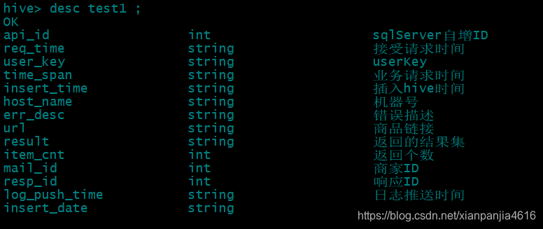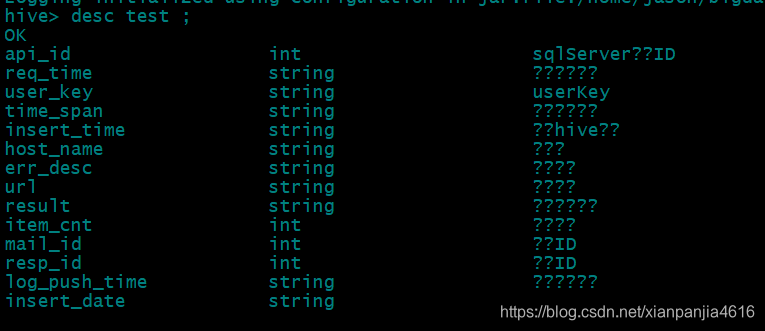 创建表的时候,comment说明字段包含中文,表成功创建成功之后,desc的时候中文说明显示乱码.如下图所示: