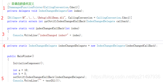 在c#中回调步骤:1定义委托->2引入C库函数->3定义静态委托函数->4定义委托变量->5设置委托