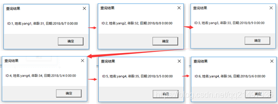 _accessServer = new AccessServer(); _accessServer.DataBaseName = "students_.mdb"; _accessServer.PASSWORD = "a1234567"; _accessServer.connectToAccess(); string cmd = ""; // 建表,Access通过vs2017验证,报不支持create table sql语句,但是实际见表成功 // 具体细节,还需要进一步研究 //cmd = "CREATE TABLE student2(" + //"no VARCHAR(2) NOT NULL," + //"name VARCHAR(12) NOT NULL," + //"age INT NOT NULL)"; //if (!_accessServer.doQuery(cmd)) //{ //MessageBox.Show(string.Format("执行失败:{0}", cmd), "错误"); //} // 插入数据 cmd = "INSERT INTO student VALUES('4','yang4',34,'2018-03-04')"; if (!_accessServer.doQuery(cmd)) { MessageBox.Show(string.Format("执行失败:{0}", cmd), "错误"); } cmd = "INSERT INTO student VALUES('5','yang4',35,'2018-03-05')"; if (!_accessServer.doQuery(cmd)) { MessageBox.Show(string.Format("执行失败:{0}", cmd), "错误"); } cmd = "INSERT INTO student VALUES('6','yang4',36,'2018-03-06')"; if (!_accessServer.doQuery(cmd)) { MessageBox.Show(string.Format("执行失败:{0}", cmd), "错误"); } cmd = "SELECT * FROM student"; // 返回数据集 OleDbDataReader rd = _accessServer.doQueryReturnData(cmd); if (rd == null) { MessageBox.Show(string.Format("执行失败:{0}", cmd), "错误"); } else { while (rd.Read()) { MessageBox.Show(string.Format("ID:{0}, 姓名:{1}, 年龄:{2}, 日期:{3}", rd["ID"].ToString(), rd["姓名"].ToString(), rd["年龄"].ToString(), rd["日期"].ToString()), "查询结果"); } } // 关闭数据库 _accessServer.disconnectFromAccess();