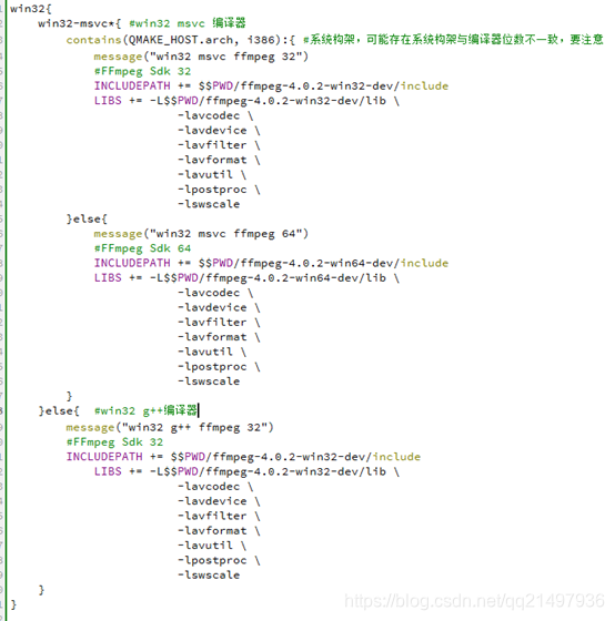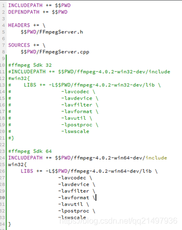 INCLUDEPATH += $$PWD/ffmpeg-4.0.2-win32-dev/include LIBS += -L$$PWD/ffmpeg-4.0.2-win32-dev/lib \ -lavcodec \ -lavdevice \ -lavfilter \ -lavformat \ -lavutil \ -lpostproc \ -lswscale