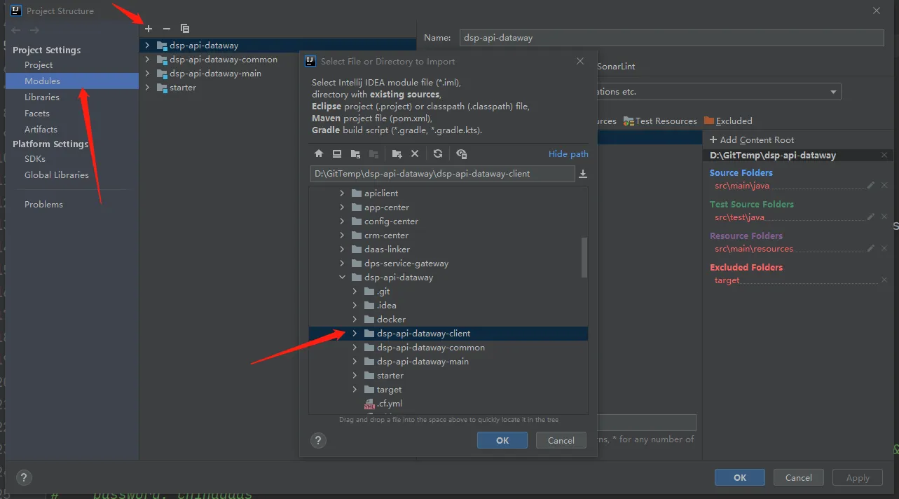 2、在中间文件夹这一列找到刚刚的父级 module,选中后点击列顶部的加号“+”,在弹出框选择“Import Module”,找到要加入 module 的子级文件夹,点击OK。