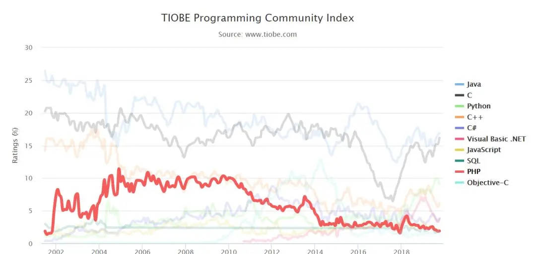 可以明显看出 PHP 虽然也算是一个比较流行的编程语言,但其历史上就从来没有成为过第一,在 PHP 最巅峰时刻,排名成绩也只能在第三、四名。