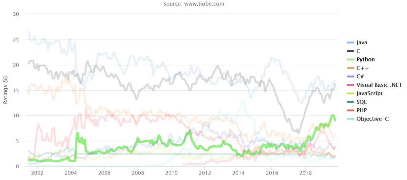 关于这个问题,我们很容易在 TIOBE 排行榜上得到求证,上图是2002-2019年前10大编程语言排行情况。