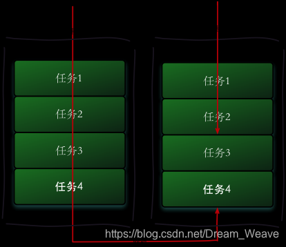 一个大任务分割为若干个互不依赖的子任务,为了减少线程间的竞争,把这些子任务分别放到不同的队列里,并未每个队列创建一个单独的线程来执行队列里的任务,线程和队列一一对应。比如线程1负责处理1队列里的任务,2线程负责2队列的。但是有的线程会先把自己队列里的任务干完,而其他线程对应的队列里还有任务待处理。干完活的线程与其等着,不如帮其他线程干活,于是它就去其他线程的队列里窃取一个任务来执行。而在这时它们可能会访问同一个队列,所以为了减少窃取任务线程和被窃取任务线程之间的竞争,通常会使用双端队列,被窃取任务线程永远从双端队列的头部拿任务执行,而窃取任务线程永远从双端队列的尾部拿任务执行。