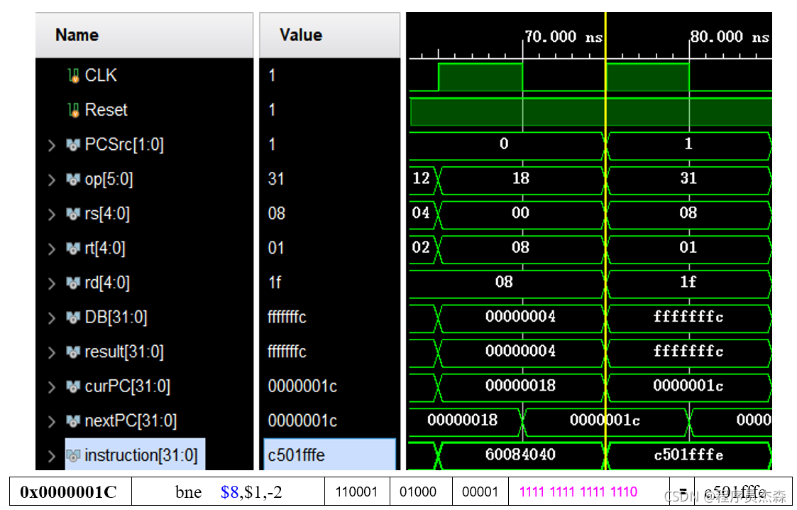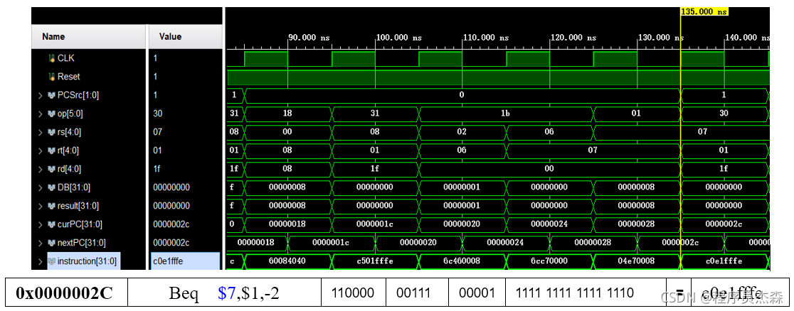 第14个周期中,指令地址为c0e1fffe,在程序测试段中,可以看到,本条指令为beq,那么现在开始检验指令beq的实现过程:指令beq的功能是:if(rs=rt) pc←pc + 4 + (sign-extend)immediate <<2 else pc ←pc + 4,immediate是从PC+4地址开始和转移到的指令之间指令条数。