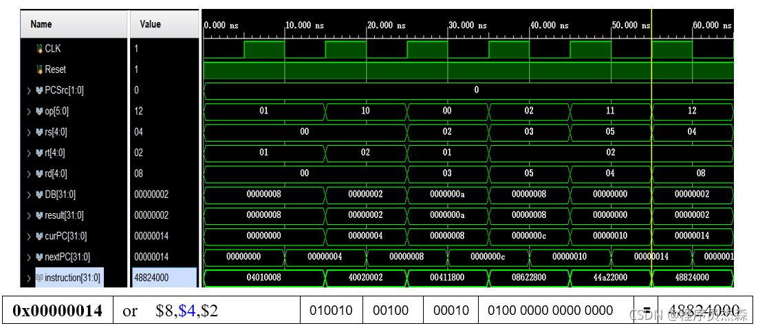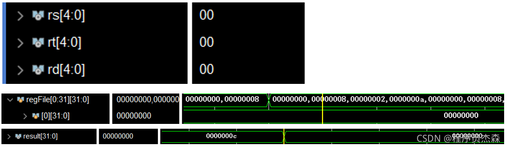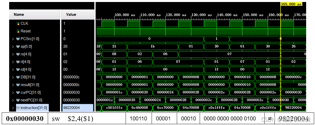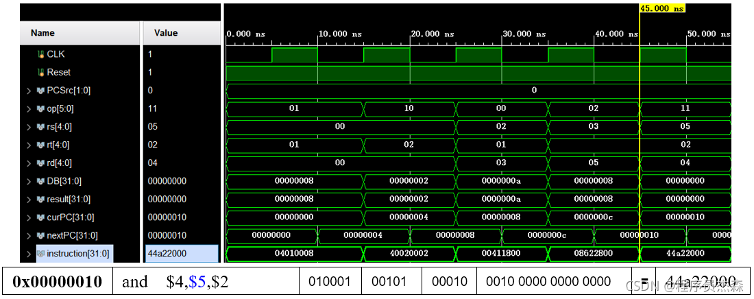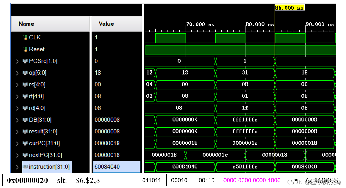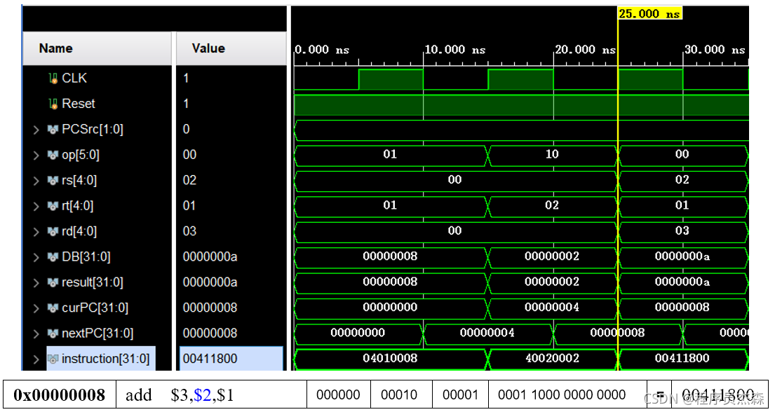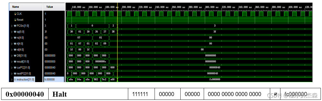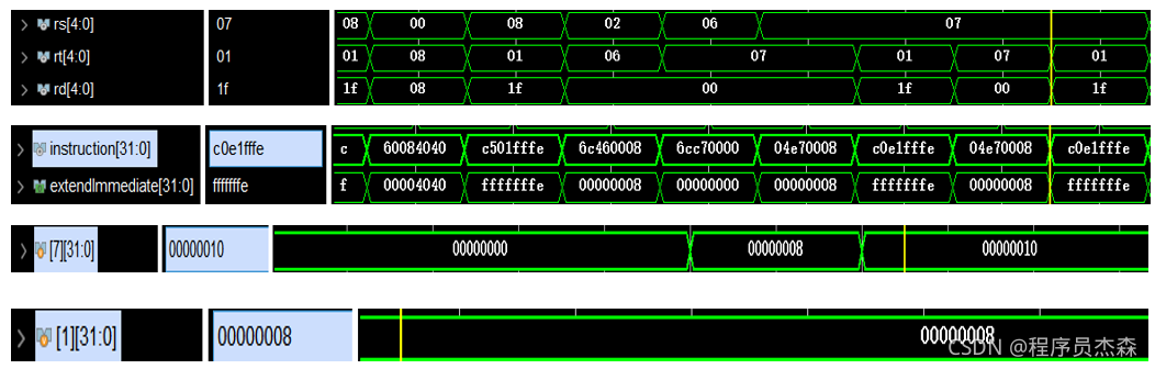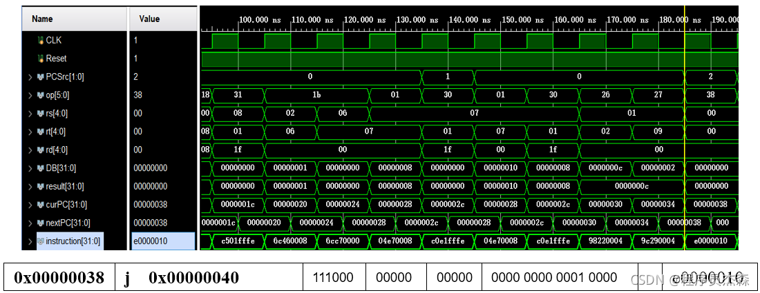 由于MIPS32的指令代码长度占4个字节,所以指令地址二进制数最低2位均为0,将指令地址放进指令代码中时,可省掉!这样,除了最高6位操作码外,还有26位可用于存放地址,事实上,可存放28位地址了,剩下最高4位由pc+4最高4位拼接上。指令验证过程如下,最后结论为:单元工作正常,功能实现完好。