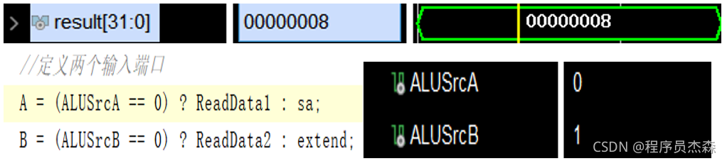 首先找到rs在本周期中存放的源操作数地址,rs=00;然后在Objects中添加immediate组件,找到立即数的值,immediate=8;最后进入ALU分析计算结果,在ALU的代码文件中有两个引脚,ALUSrcA和ALUSrcB,它们在第一个周期中的值分别是0和1,则A端口进行ReadData1,B端口进行extend,计算结果为result=8,指令执行正确,可以实现数据相加功能。