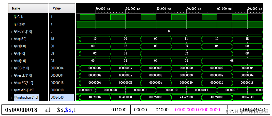 分析第七个周期,指令地址为60084040,在程序测试段中,可以看到,本条指令为sll,那么现在开始检验指令sll的实现过程:指令sll的功能是rd<-rt<<(zero-extend)sa,左移sa位 ,(zero-extend)sa。源操作数寄存器地址:rt=08 ,寻求真值,移位数sa=1,程序运行后 。在二进制数据计算中,左移一位就相当于乘以2,故程序结果正确,该单元工作正常。