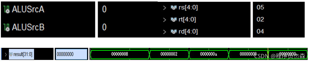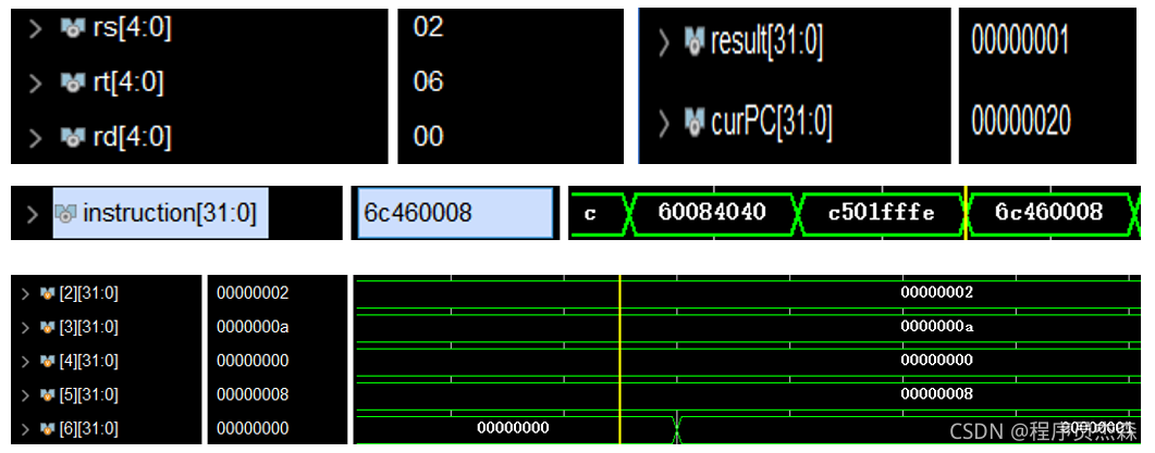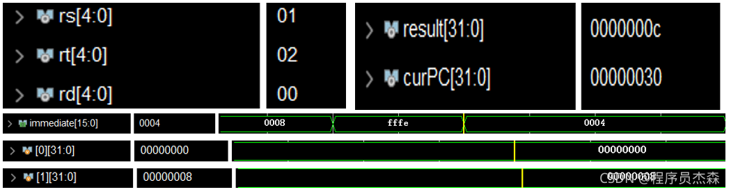 读取rs寄存器内容和立即数符号扩展后的数相加作为地址的内存单元中的数,然后保存到rt寄存器中。同样的依次找到源操作数在寄存器中的值,进入ALU运算后,检验结果,过程图展示如下,结果无误,单元功能实现完好。