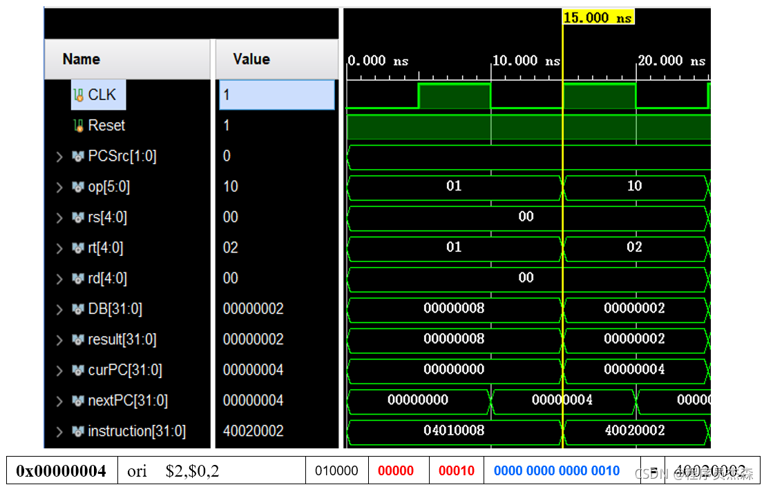 分析第二个周期,指令地址为40020002,在程序测试段中,可以看到,本条指令为ori,那么现在开始检验指令ori的实现过程:指令ori的功能是rt←rs | (zero-extend)immediate; immediate符号扩展再参加“或”运算。寄存器源操作数地址:rs=0,immediate=2;