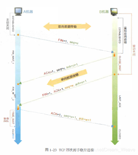 图1-23中的红色字体所示的 TIME_WAIT和 CLOSE_WAIT分别表示主动关闭和被动关闭产生的阶段性状态, 如果在线上服务器大量出现这两种状态,就会加重机器负载,也会影响有效连接的创建, 因此需要进行有针对性的调优处理。