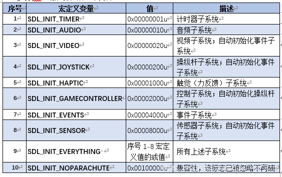 使用此函数初始化SDL库,必须在使用大多数其他SDL函数之前调用它,初始化的时候尽量做到“够用就好”,而不要用SDL_INIT_EVERYTHING。会出现一些不可预知的问题。