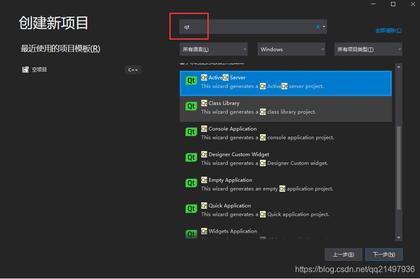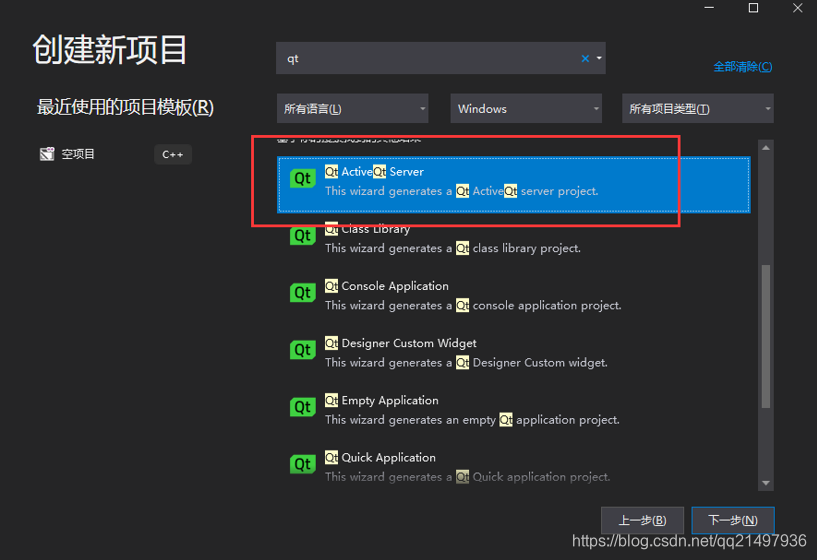 QtCreator是没有Activex控件项目的,所以需要使用VS,笔者使用VS2019开发。