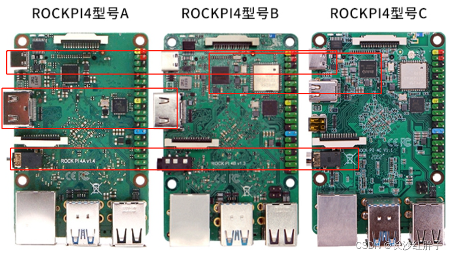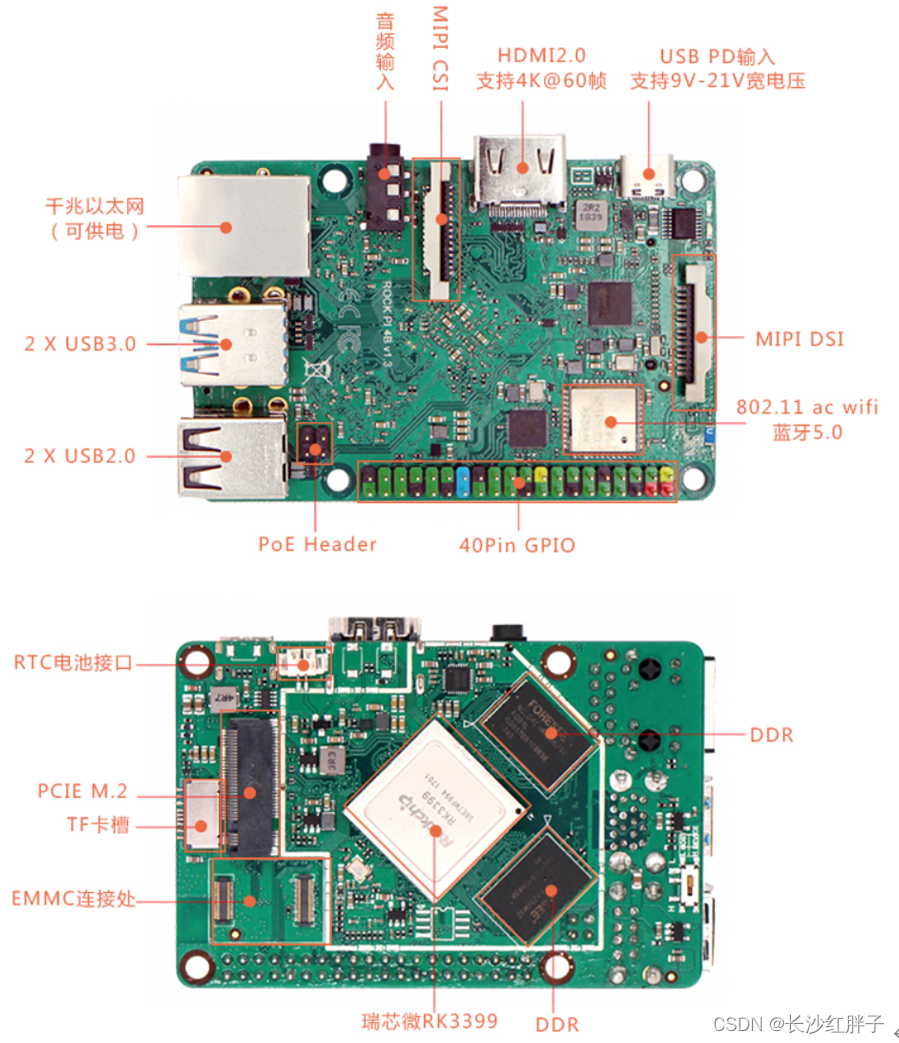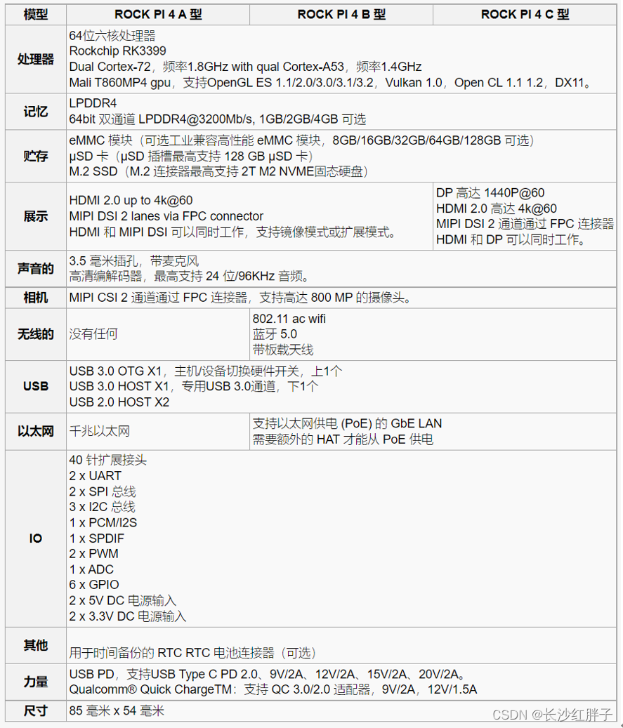 ROCK Pi 4 是 Radxa 基于 Rockchip RK3399的 SBC(单板计算机)。它可以运行 android 或一些 Linux 发行版。ROCK Pi 4 配备六核 ARM 处理器、64 位双通道 3200Mb/s LPDDR4、最高 4K@60 HDMI、MIPI DSI、MIPI CSI、3.5mm 麦克风插孔、802.11 ac WIFI、蓝牙 5.0、USB 端口、GbE LAN、 40 针彩色扩展接头,RTC。此外,ROCK Pi 4 支持 USB PD 和 QC 供电。 ROCK Pi 4 有两种型号,型号 A 和型号 B,每种型号都有 1GB、2GB 或 4GB 内存选项。