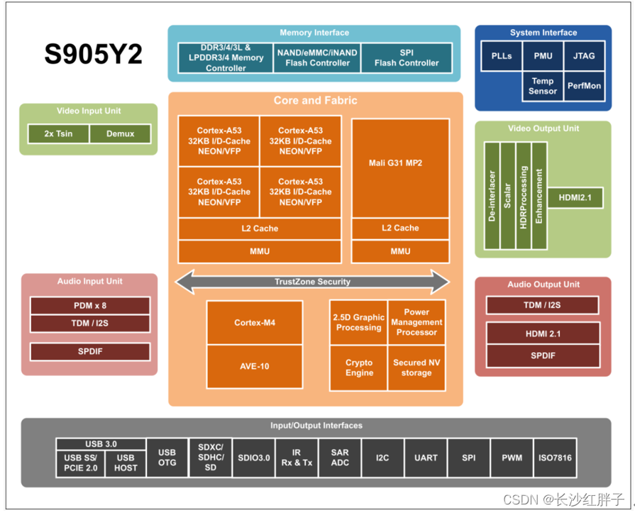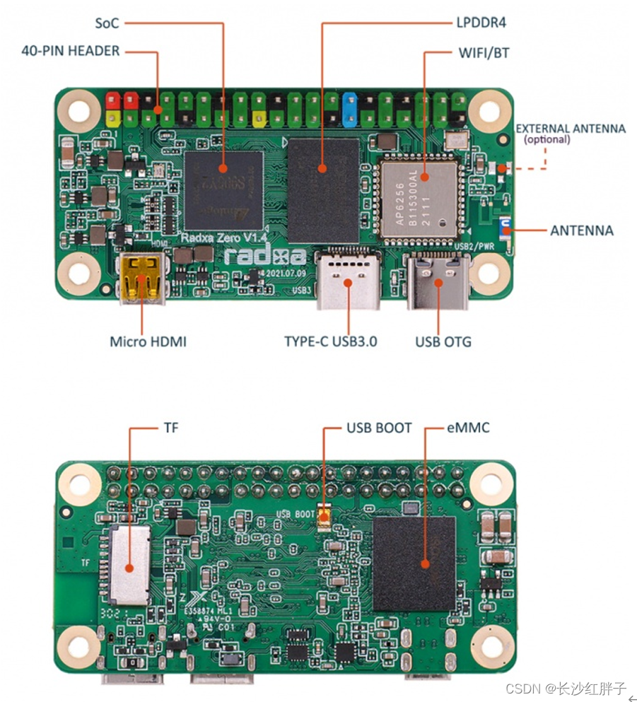 Radxa Zero 中使用的 SoC 是 Amlogic S905Y2。主系统CPU为四核ARM Cortex-A53 CPU,统一L2缓存,提升系统性能。此外,Cortex-A53 CPU 包括 NEON SIMD 协处理器,以提高软件媒体处理能力。图形子系统由两个图形引擎和一个灵活的视频/图形输出管道组成。ARM G31 MP2 GPU 支持 OpenGL ES 3.2、Vulkan 1.0 和 OpenCL 2.0,而 2.5D 图形处理器处理额外的缩放、alpha、旋转和色彩空间转换操作。
