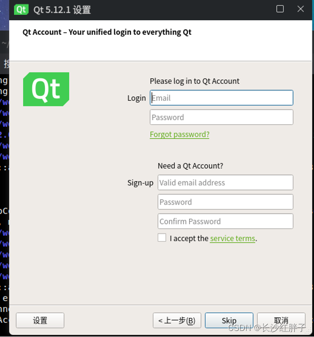 先断开网络,不然Qt必须要登录,断开网络则可点击skip选项: