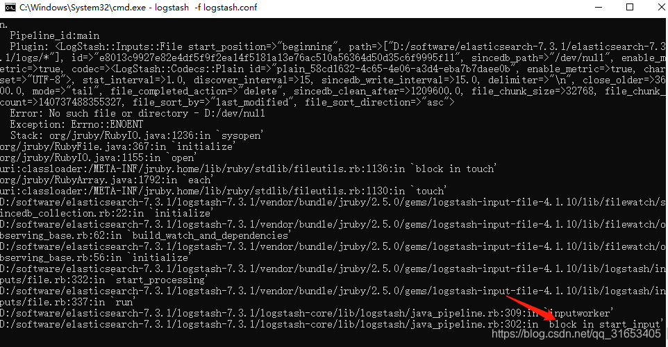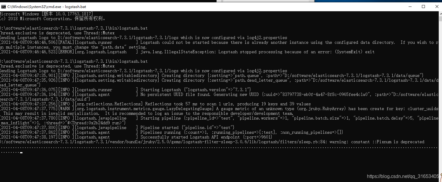 成功创建之后,cmd启动,logstash-7.3.1/bin/logstash.bat文件,配置完成后 读取logs文件,静静地等待中吧~