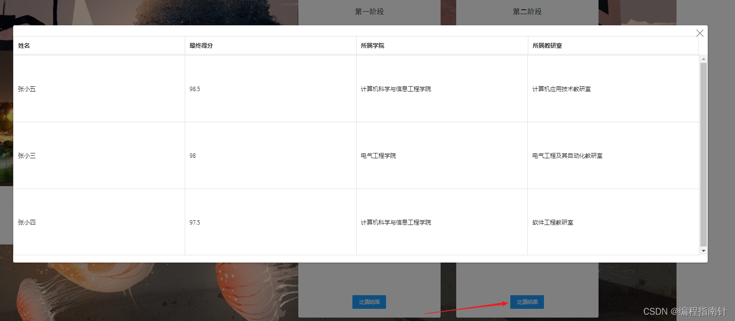 第一个阶段是:教研室比赛阶段(同一个教研室的老师比赛),同一学院下多个教研室分别选取该教研室分数高的数人晋级到第二阶段:学院比赛。