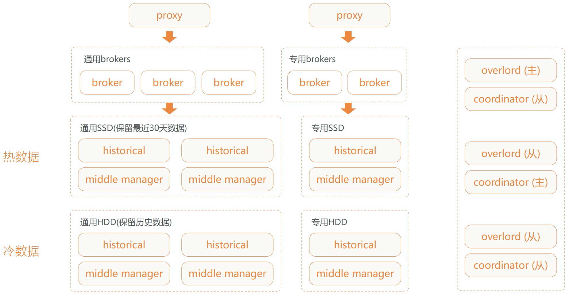 以上 所讲 Druid 的进程可以被任意部署,但是为了理解与部署组织方便。这些进程分为了三类: