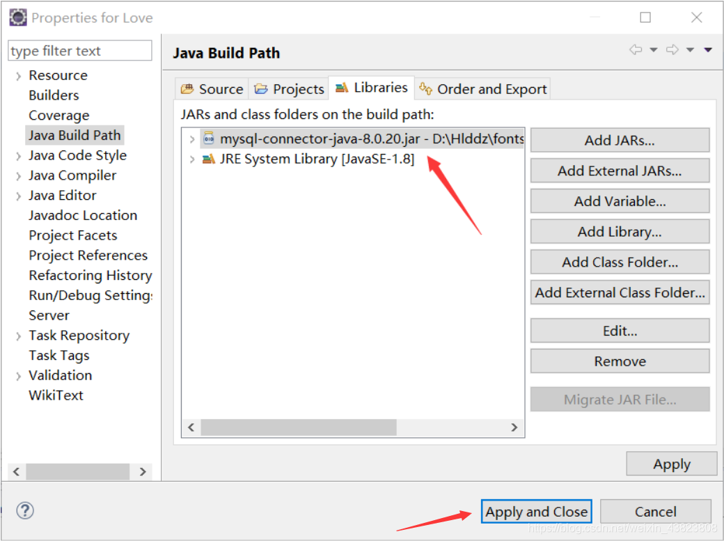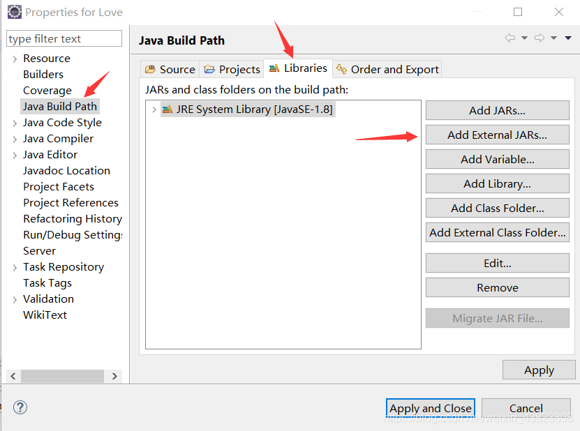 到这里,我们依次选择Java Build Path,上方的第三个Libraries,右边的第二个Add External JARs。