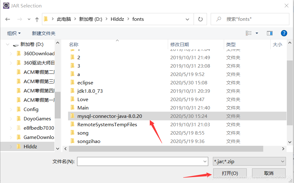 然后选择我们刚刚解压完的那个mysql-connector-java-8.0.20文件,即可成功添加数据库驱动程序。