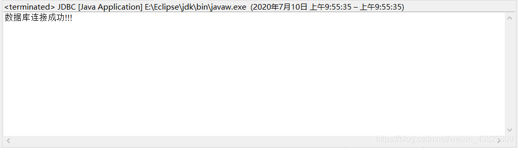 import java.sql.*; public class JDBC { public static void main(String[] args) { String driver="com.mysql.cj.jdbc.Driver";//数据库驱动类所对应的字符串 String URL="jdbc:mysql://localhost:3306/school?serverTimezone=UTC&useUnicode=true&characterEncoding=utf-8"; //URL语法格式如下 //jdbc:mysql:是固定的写法,后面跟主机名localhost,3306是默认的MySQL端口号 //serverTimezone=UTC是指定时区时间为世界统一时间 //useUnicode=true是指是否使用Unicode字符集,赋值为true //characterEncoding=utf-8是指定字符编码格式为UTF8 Connection conn=null; //Connection接口代表Java程序和数据库的连接对象,只有获得该连接对象后,才能访问数据库,并操作数据表 try { Class.forName(driver);//加载MySQL数据库驱动 }catch(java.lang.ClassNotFoundException e) {//如果找不到这个类,执行下面的异常处理 System.out.println("驱动程序配置未配置成功!!!"); } try { conn=DriverManager.getConnection(URL,"root","123123");//建立和数据库的连接,并返回表示连接的Connection对象 System.out.println("数据库连接成功!!!"); }catch(Exception e) {//未连接成功,执行下面的异常处理 System.out.println("数据库连接失败!!!"); } } }