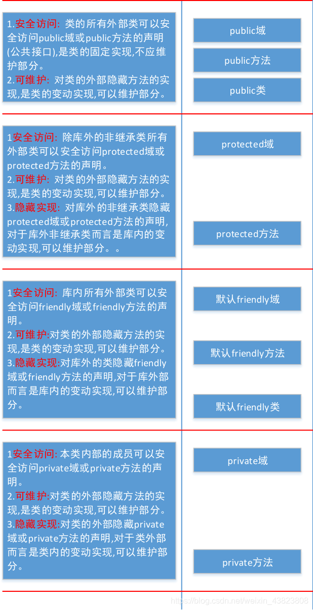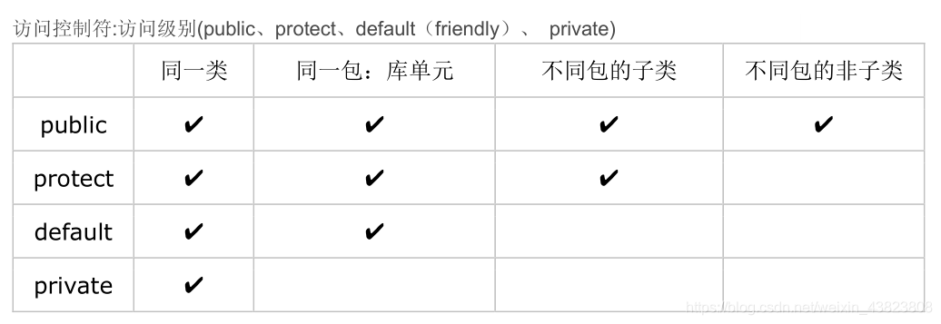 这四者的访问级别从高到低依次是:public > protected > 默认(default、friendly)> private。见下图👇👇👇