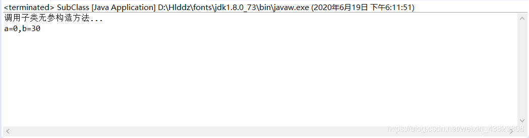 这里,首先通过语句:SubClass obj=new SubClass(); 去 public SubClass() 中执行第一行,先 super() 执行父类无参构造方法,而父类中是一个无代码实现的无参实例构造方法,所以并没有什么改变和输出,之后回到 public SubClass() 中执行第二行,进行输出,最后将b的值修改为30,因为a未赋值,所以为0,也就是上图的运行结果!!!