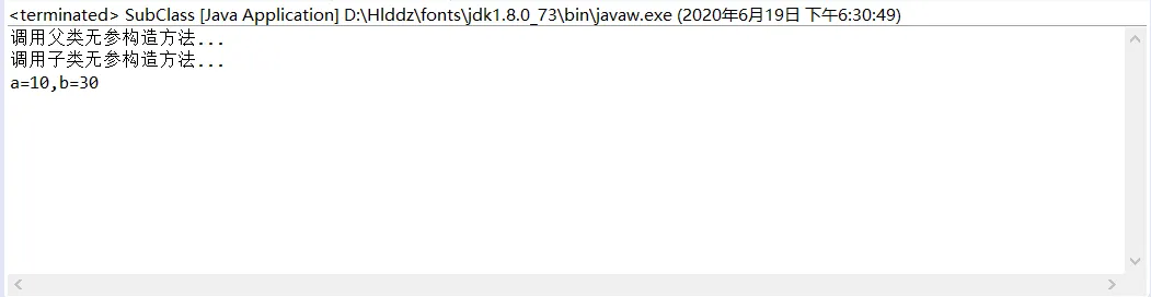 这里,首先通过语句:SubClass obj=new SubClass(); 去 public SubClass() 中执行第一行,先 super() 执行父类无参构造方法,而父类的无参构造方法中也有一个 super() ,这里会往Java中的Object类中走(这里不做详细解释),在父类无参构造方法中,先进行输出,再把a赋值为10,之后回到 public SubClass() 中执行第二行,进行输出,最后将b的值修改为30,也就是如下图的运行结果!!!👇👇👇