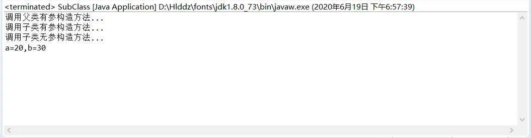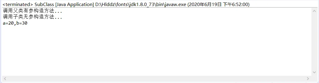 这个例子中,首先通过语句:SubClass obj=new SubClass(); 去 public SubClass() 中执行第一行,先 super(20) 执行父类有参构造方法,而父类的有参构造方法中也有一个 super(),这里会往Java中的Object类中走(这里不做详细解释),在父类有参构造方法中,先进行输出,再把a赋值为20,之后回到 public SubClass() 中执行第二行,进行输出,最后将b的值修改为30,也就是如下图的运行结果!!!👇👇👇