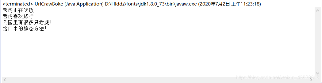 //文件名:PlayAnimal.java public class PlayAnimal { public static void main(String[] args) { Tiger a=new Tiger(); a.eat(); a.travel();//抽象方法和默认方法通过实现该接口的类的实例对象来调用 System.out.println(a.park()); LikeAnimal.ab();//通过 接口名.方法名 来调用接口中的静态方法 } }