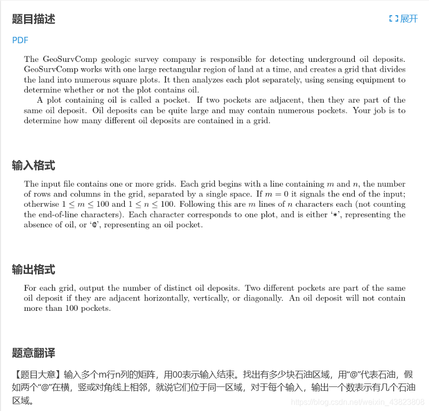 #include<iostream> #include<cstdio> #include<cstring> using namespace std; char s[101][101];//存入地图的数组 int sum,n,m; int vis[101][101];//标记数组 int dx[]={-1,0,1,-1,1,-1,0,1};//题中说的是横、竖、对角线,所以有8个方向 int dy[]={-1,-1,-1,0,0,1,1,1}; bool judge(int x,int y) { if(x>=0&&x<n&&y>=0&&y<m&&vis[x][y]==0&&s[x][y]=='@')//越界判断 return true; return false; } void dfs(int x,int y) { vis[x][y]=1;//标记访问过的每个点 for(int k=0;k<8;k++) {//8个方向搜索 int tx=x+dx[k]; int ty=y+dy[k]; if(judge(tx,ty)) { dfs(tx,ty); } } } int main() { while(~scanf("%d %d",&n,&m)) {//多实例输入 if(!n&&!m)//n和m均为0,输入结束 break; for(int i=0;i<n;i++) for(int j=0;j<m;j++) scanf(" %c",&s[i][j]);//%前面的空格确保地图可以完整输入 memset(vis,0,sizeof(vis));//标记数组清零 sum=0;//油田数量 for(int i=0;i<n;i++) { for(int j=0;j<m;j++) { if(vis[i][j]==0&&s[i][j]=='@') {//此点未被访问,从找到的某个油田处开始搜索 sum++;//数量加1,并且搜索出与这个油田相连的所有油田,算1个石油区域 dfs(i,j); } } } printf("%d\n",sum); } return 0; }