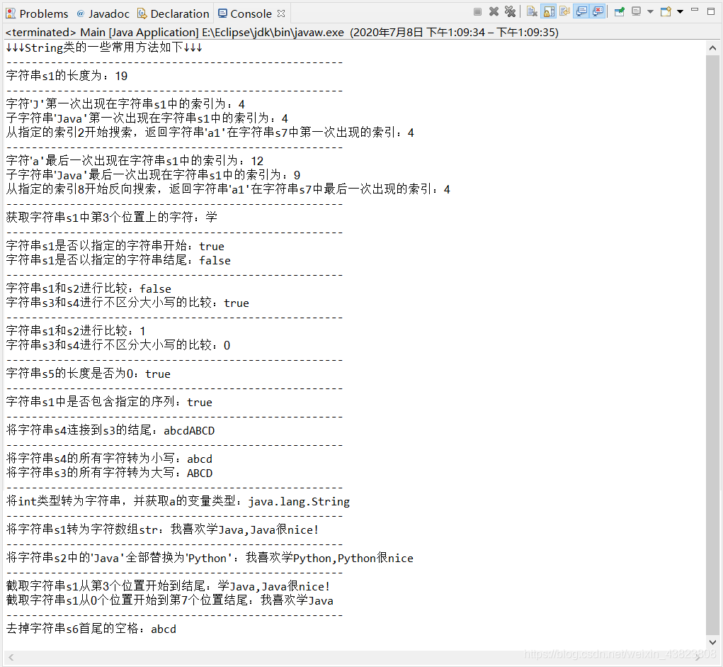 public class Main { public static String getType(Object o) {//定义一个静态方法,获取变量的类型,通过类Main来调用它 return o.getClass().getName(); } public static void main(String[] args) { String s1=new String("我喜欢学Java,Java很nice!");//这里全部使用String类的构造方法来初始化字符串对象 String s2=new String("我喜欢学Java,Java很nice"); String s3=new String("abcd"); String s4=new String("ABCD"); String s5=new String(""); String s6=new String(" abcd "); String s7=new String("a123a123b456"); char[] str=s1.toCharArray(); int a=5; System.out.println("↓↓↓String类的一些常用方法如下↓↓↓"); System.out.println("-----------------------------------------------------"); System.out.println("字符串s1的长度为:" + s1.length()); System.out.println("-----------------------------------------------------"); System.out.println("字符'J'第一次出现在字符串s1中的索引为:" + s1.indexOf('J')); System.out.println("子字符串'Java'第一次出现在字符串s1中的索引为:" + s1.indexOf("Java")); System.out.println("从指定的索引2开始搜索,返回字符串'a1'在字符串s7中第一次出现的索引:" + s7.indexOf("a1",2)); System.out.println("-----------------------------------------------------"); System.out.println("字符'a'最后一次出现在字符串s1中的索引为:" + s1.lastIndexOf('a')); System.out.println("子字符串'Java'最后一次出现在字符串s1中的索引为:" + s1.lastIndexOf("Java")); System.out.println("从指定的索引8开始反向搜索,返回字符串'a1'在字符串s7中最后一次出现的索引:"+s7.lastIndexOf("a1",8)); System.out.println("-----------------------------------------------------"); System.out.println("获取字符串s1中第3个位置上的字符:" + s1.charAt(3)); System.out.println("-----------------------------------------------------"); System.out.println("字符串s1是否以指定的字符串开始:" + s1.startsWith("我喜欢")); System.out.println("字符串s1是否以指定的字符串结尾:" + s1.endsWith("nice")); System.out.println("-----------------------------------------------------"); System.out.println("字符串s1和s2进行比较:" + s1.equals(s2)); System.out.println("字符串s3和s4进行不区分大小写的比较:" + s3.equalsIgnoreCase(s4)); System.out.println("-----------------------------------------------------"); System.out.println("字符串s1和s2进行比较:" + s1.compareTo(s2)); System.out.println("字符串s3和s4进行不区分大小写的比较:" + s3.compareToIgnoreCase(s4)); /*compareTo(String anotherString)方法将当前字符串与参数字符串进行比较, 如果相同,则返回0。 不相同时,从两个字符串第1个字符开始比较,返回第一个不相等的字符差,按照字典顺序 另一种情况,某个字符串和其子串进行比较,返回它们的长度差。 compareToIgnoreCase(str)与compareTo的区别是忽略了大小写*/ System.out.println("-----------------------------------------------------"); System.out.println("字符串s5的长度是否为0:" + s5.isEmpty()); System.out.println("-----------------------------------------------------"); System.out.println("字符串s1中是否包含指定的序列:" + s1.contains("Java")); System.out.println("-----------------------------------------------------"); System.out.println("将字符串s4连接到s3的结尾:" + s3.concat(s4)); System.out.println("-----------------------------------------------------"); System.out.println("将字符串s4的所有字符转为小写:" + s4.toLowerCase()); System.out.println("将字符串s3的所有字符转为大写:" + s3.toUpperCase()); System.out.println("-----------------------------------------------------"); System.out.println("将int类型转为字符串,并获取a的变量类型:" + Main.getType(String.valueOf(a))); System.out.println("-----------------------------------------------------"); System.out.print("将字符串s1转为字符数组str:");//见代码第13行 System.out.println(str); System.out.println("-----------------------------------------------------"); System.out.println("将字符串s2中的'Java'全部替换为'Python':" + s2.replace("Java","Python")); System.out.println("-----------------------------------------------------"); System.out.println("截取字符串s1从第3个位置开始到结尾:" + s1.substring(3)); System.out.println("截取字符串s1从0个位置开始到第7个位置结尾:" + s1.substring(0,8)); System.out.println("-----------------------------------------------------"); System.out.println("去掉字符串s6首尾的空格:" + s6.trim()); } }
