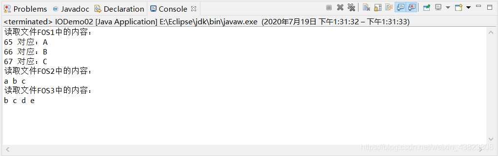 import java.io.*; public class IODemo02 { public static void main(String[] args) throws IOException { //创建FileInputStream对象,构造方法中绑定要读取的数据源 FileInputStream fis1=new FileInputStream("E:/Eclipse/Java Project/Love/FOS1.txt"); System.out.println("读取文件FOS1中的内容:"); int len=0; //read()方法是一个字节一个字节的进行读取 while((len=fis1.read())!=-1) { System.out.print((char)len + " "); } /*int byte0=fis1.read(); char ch0=(char)byte0;//65 对应字符 A System.out.println(byte0 + " 对应:" + ch0); int byte1=fis1.read(); char ch1=(char)byte1;//66 对应字符 B System.out.println(byte1 + " 对应:" + ch1); int byte2=fis1.read(); char ch2=(char)byte2;//67 对应字符 C System.out.println(byte2 + " 对应:" + ch2); int byte3=fis1.read(); char ch3=(char)byte3; System.out.println(byte3 + " 对应:" + ch3); 此时已将FOS1文件中的内容全部读完,再进行读取,将输出-1*/ fis1.close();//关闭字节输入流,并释放资源 System.out.print(); FileInputStream fis2=new FileInputStream("E:/Eclipse/Java Project/Love/FOS2.txt"); System.out.println("读取文件FOS2中的内容:"); byte[] bytes1=new byte[3]; int len1=fis2.read(bytes1); for(int i=0;i<len1;i++) { char ch3=(char)bytes1[i]; System.out.print(ch3 + " "); } fis2.close();//关闭字节输入流,并释放资源 System.out.println(); FileInputStream fis3=new FileInputStream("E:/Eclipse/Java Project/Love/FOS3.txt"); System.out.println("读取文件FOS3中的内容:"); byte[] bytes2=new byte[5]; int len2=fis3.read(bytes2,1,4);//len2=4 for(int i=1;i<=4;i++) { char ch4=(char)bytes2[i]; System.out.print(ch4 + " "); } fis3.close();//关闭字节输入流,并释放资源 System.out.println(); } }